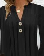 SPECIFIKATIONER Top type: Toppe Stil: Afslappet Materiale: Spandex,Polyester Lejlighed: Daglig Halsudskæring: V-udskæring Ærmetype: Almindeligt ærme Ærmelængde: Langærmet Pasform: Almindelig Sæson/årstid: Forår,Efterår Detaljer: Knapper,Rynket Pakken inkluderer: 1 x Top STØRRELSESTABEL (cm) Størrelse Buste Længde S 97 65 M 101 66.5 L 1...