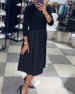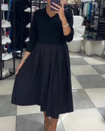 Patchwork kjole med V-udskæring og plisseret nederdel