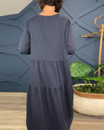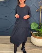 Afslappet ensfarvet patchworkkjole med rund hals