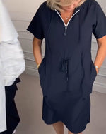 SPECIFIKATIONER Stil: Afslappet Materiale: Bomuldsblanding Kjoletype: Shift-kjole Kjolelængde: Over knæet Halsudskæring: Rund hals Mønstertype: Farveblok Ærmetype: Almindeligt ærme Ærmelængde: Kortærmet Detaljer: Lomme Pasform: Almindelig Sæson/årstid: Forår,Sommer Lejlighed: Daglig Pakken inkluderer: 1 x Kjole STØRRELSESTABEL (cm) Størrelse...