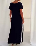 SPECIFIKATIONER Stil: Afslappet Materiale: Bomuldsblanding Kjoletype: Shift-kjole Kjolelængde: Maxi Halsudskæring: Rund hals Mønstertype: Ensfarvet Ærmetype: Almindeligt ærme Ærmelængde: Halve ærmer Detaljer: Flænge Pasform: Almindelig Sæson/årstid: Forår,Sommer Lejlighed: Daglig Pakken inkluderer: 1 x Kjole STØRRELSESTABEL (cm) Størrel...