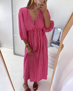 SPECIFIKATIONER Stil: Afslappet Materiale: Bomuldsblanding Kjoletype: Shift-kjole Kjolelængde: Maxi Halsudskæring: V-udskæring Mønstertype: Farveblok Ærmetype: Almindeligt ærme Ærmelængde: Trekvartærmet Detaljer: Lomme Pasform: Almindelig Sæson/årstid: Forår,Sommer Lejlighed: Daglig Pakken inkluderer: 1 x Kjole STØRRELSESTABEL (cm) Størrelse...