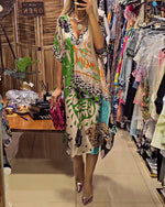 SPECIFIKATIONER Stil: Afslappet Materiale: Bomuldsblanding Kjoletype: Shift-kjole Kjolelængde: Maxi Halsudskæring: V-udskæring Mønstertype: Farveblok Ærmetype: Almindeligt ærme Ærmelængde: Trekvartærmet Detaljer: Lomme Pasform: Almindelig Sæson/årstid: Forår,Sommer Lejlighed: Daglig Pakken inkluderer: 1 x Kjole STØRRELSESTABEL (cm) Størrelse...