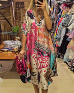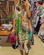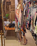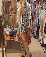 Farverig patchworkkjole med leopardmotiv og delvist leopardprint