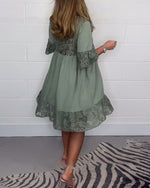 Elegant ensfarvet løs kjole med blonder og V-udskæring