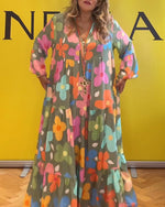 SPECIFIKATIONER Stil: Afslappet Materiale: Bomuldsblanding Kjoletype: Shift-kjole Kjolelængde: Maxi Halsudskæring: V-udskæring Mønstertype: Farveblok Ærmetype: Almindeligt ærme Ærmelængde: Trekvartærmet Detaljer: Lomme Pasform: Almindelig Sæson/årstid: Forår,Sommer Lejlighed: Daglig Pakken inkluderer: 1 x Kjole STØRRELSESTABEL (cm) Størrelse...