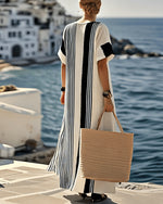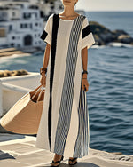 SPECIFIKATIONER Stil: Afslappet Materiale: Bomuldsblanding Kjoletype: Shift-kjole Kjolelængde: Over knæet Halsudskæring: V-udskæring Mønstertype: Stribet Ærmetype: Almindeligt ærme Ærmelængde: Kortærmet Pasform: Almindelig Sæson/årstid: Forår,Sommer Lejlighed: Daglig Pakken inkluderer: 1 x Kjole STØRRELSESTABEL (cm) Størrelse Buste Længd...