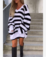 V-halset striksweaterkjole med sort-hvide striber