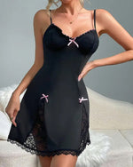 SPECIFIKATIONER Stil: Sexet Materiale: Bomuldsblanding Halsudskæring: Spaghetti-stropper Ærmelængde: Uden ærmer Detaljer: Patchwork,Gennemsigtig,Høj åbning,Sløjfeknude,Snøre Pasform: Almindelig Sæson/årstid: Forår,Sommer,Efterår,Vinter Pakken inkluderer: 1 x Søvn kjole STØRRELSESTABEL (cm) Størrelse Buste Længde S 96 64 M 100 6...