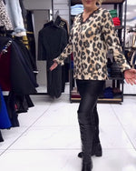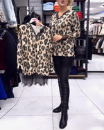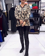 Bluse afslappet v-udskæring blondepanel med leopardprint