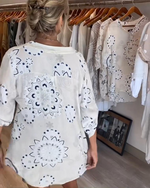 SPECIFIKATIONER Top type: Bluser Stil: Afslappet Materiale: Bomuldsblanding Lejlighed: Daglig Halsudskæring: V-udskæring Mønstertype: Tryk Ærmetype: Kronbladærme Ærmelængde: Halve ærmer Pasform: Almindelig Sæson/årstid: Forår,Sommer Pakken inkluderer: 1 x Bluse STØRRELSESTABEL (cm) Størrelse Buste Længde S 97 65 M 101 66.5 L 105 68 X...