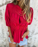 SPECIFIKATIONER Top type: Bluser Stil: Afslappet Materiale: Bomuldsblanding Lejlighed: Daglig Halsudskæring: V-udskæring Mønstertype: Ensfarvet Ærmetype: Almindeligt ærme Ærmelængde: Kortærmet Pasform: Almindelig Sæson/årstid: Forår,Sommer Detaljer: Patchwork,Knapper,Snøre Pakken inkluderer: 1 x Bluse STØRRELSESTABEL (cm) Størrelse Buste Læn...