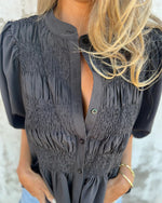 SPECIFIKATIONER Top type: Bluser Stil: Afslappet Materiale: Bomuldsblanding Lejlighed: Daglig Halsudskæring: Ståkrave Mønstertype: Tryk Ærmetype: Puf-ærmer Ærmelængde: Halve ærmer Pasform: Almindelig Sæson/årstid: Forår,Sommer,Efterår Detaljer: Pjusket Pakken inkluderer: 1 x Bluse STØRRELSESTABEL (cm) Størrelse Buste Længde S 97 65 M 101...