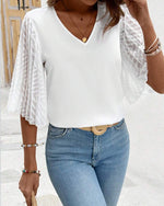 SPECIFIKATIONER Top type: Bluser Stil: Afslappet Materiale: Bomuldsblanding Lejlighed: Daglig Halsudskæring: V-udskæring Mønstertype: Ensfarvet Ærmetype: Flagermuse-ærmer Ærmelængde: Trekvartærmet Pasform: Almindelig Sæson/årstid: Forår,Sommer Detaljer: Patchwork,Udhulende Pakken inkluderer: 1 x Bluse STØRRELSESTABEL (cm) Størrelse Buste Læn...