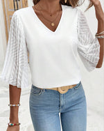 SPECIFIKATIONER Top type: Bluser Stil: Afslappet Materiale: Bomuldsblanding Lejlighed: Daglig Halsudskæring: V-udskæring Mønstertype: Ensfarvet Ærmetype: Pjuskærmer Ærmelængde: Langærmet Pasform: Almindelig Sæson/årstid: Forår,Sommer Detaljer: Pjusket Pakken inkluderer: 1 x Bluse STØRRELSESTABEL (cm) Størrelse Buste Længde S 97 65 M...
