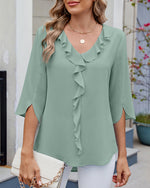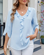 SPECIFIKATIONER Top type: Bluser Stil: Afslappet Materiale: Bomuldsblanding Lejlighed: Daglig Halsudskæring: V-udskæring Mønstertype: Ensfarvet Ærmetype: Pjuskærmer Ærmelængde: Langærmet Pasform: Almindelig Sæson/årstid: Forår,Sommer Detaljer: Pjusket Pakken inkluderer: 1 x Bluse STØRRELSESTABEL (cm) Størrelse Buste Længde S 97 65 M...