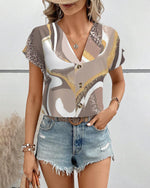 SPECIFIKATIONER Top type: Bluser Stil: Afslappet Materiale: Bomuldsblanding Lejlighed: Daglig Halsudskæring: V-udskæring Mønstertype: Tryk Ærmetype: Kronbladærme Ærmelængde: Halve ærmer Pasform: Almindelig Sæson/årstid: Forår,Sommer Pakken inkluderer: 1 x Bluse STØRRELSESTABEL (cm) Størrelse Buste Længde S 97 65 M 101 66.5 L 105 68 X...