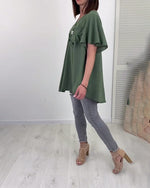 SPECIFIKATIONER Top type: Bluser Stil: Afslappet Materiale: Bomuldsblanding Lejlighed: Daglig Halsudskæring: V-udskæring Mønstertype: Ensfarvet Ærmetype: Almindeligt ærme Ærmelængde: Kortærmet Pasform: Almindelig Sæson/årstid: Forår,Sommer Detaljer: Patchwork,Knapper,Snøre Pakken inkluderer: 1 x Bluse STØRRELSESTABEL (cm) Størrelse Buste Læn...