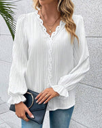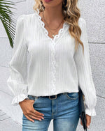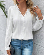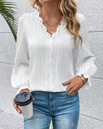 SPECIFIKATIONER Top type: Bluser Stil: Afslappet Materiale: Bomuldsblanding Lejlighed: Daglig Halsudskæring: V-udskæring Mønstertype: Ensfarvet Ærmetype: Pjuskærmer Ærmelængde: Langærmet Pasform: Almindelig Sæson/årstid: Forår,Sommer Detaljer: Pjusket Pakken inkluderer: 1 x Bluse STØRRELSESTABEL (cm) Størrelse Buste Længde S 97 65 M...