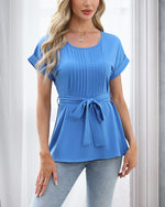 Bluse Plisseret Rund Hals Ensfarvet Med Bindebånd