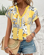 Bluse V-Hals Korte Ærmer Blomstermønster