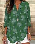 SPECIFIKATIONER Top type: Bluser Stil: Afslappet Materiale: Bomuldsblanding Lejlighed: Daglig Halsudskæring: Revers Mønstertype: Tryk Ærmetype: Almindeligt ærme Ærmelængde: Trekvartærmet Pasform: Almindelig Sæson/årstid: Forår,Sommer,Efterår Pakken inkluderer: 1 x Bluse STØRRELSESTABEL (cm) Størrelse Buste Længde S 92 65 M 96 66.5 L 10...
