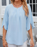 SPECIFIKATIONER Top type: Bluser Stil: Afslappet Materiale: Bomuldsblanding Lejlighed: Daglig Halsudskæring: V-udskæring Mønstertype: Ensfarvet Ærmetype: Vidærmet Ærmelængde: Trekvartærmet Pasform: Almindelig Sæson/årstid: Forår,Sommer Detaljer: Gennemsigtig Pakken inkluderer: 1 x Bluse STØRRELSESTABEL (cm) Størrelse Buste Længde S 97 65 ...