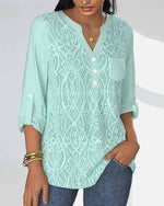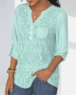 SPECIFIKATIONER Top type: Bluser Stil: Afslappet Materiale: Bomuldsblanding Lejlighed: Daglig Halsudskæring: V-udskæring Mønstertype: Tryk Ærmetype: Almindeligt ærme Ærmelængde: Ni-punkts-ærmer Pasform: Almindelig Sæson/årstid: Forår,Sommer Detaljer: Patchwork,Knapper,Udhulende Pakken inkluderer: 1 x Bluse STØRRELSESTABEL (cm) Størrelse Bust...