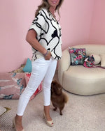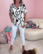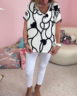 Kortærmet afslappet top med V-udskæring og kontrastprint
