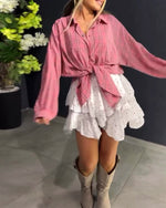SPECIFIKATIONER Top type: Skjorte Stil: Afslappet Materiale: Bomuldsblanding Lejlighed: Daglig Halsudskæring: V-udskæring Mønstertype: Ensfarvet Ærmetype: Pjuskærmer Ærmelængde: Langærmet Pasform: Almindelig Sæson/årstid: Forår,Sommer,Efterår Detaljer: Knapper,Sløjfeknude Pakken inkluderer: 1 x Skjorte STØRRELSESTABEL (cm) Størrelse Buste Læ...