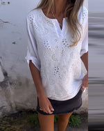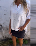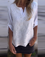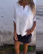 SPECIFIKATIONER Top type: Bluser Stil: Afslappet Materiale: Bomuldsblanding Lejlighed: Daglig Halsudskæring: V-udskæring Mønstertype: Ensfarvet Ærmetype: Flagermuse-ærmer Ærmelængde: Trekvartærmet Pasform: Almindelig Sæson/årstid: Forår,Sommer Detaljer: Patchwork,Udhulende Pakken inkluderer: 1 x Bluse STØRRELSESTABEL (cm) Størrelse Buste Læn...