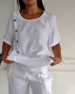SPECIFIKATIONER Top type: Bluser Stil: Afslappet Materiale: Bomuldsblanding Lejlighed: Daglig Halsudskæring: V-udskæring Mønstertype: Ensfarvet Ærmetype: Almindeligt ærme Ærmelængde: Kortærmet Pasform: Almindelig Sæson/årstid: Forår,Sommer Detaljer: Patchwork,Knapper,Snøre Pakken inkluderer: 1 x Bluse STØRRELSESTABEL (cm) Størrelse Buste Læn...