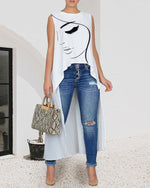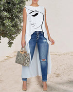 Ærmeløs top i uregelmæssig længde med portrætmotiv