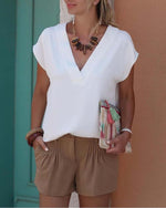SPECIFIKATIONER Top type: Bluser Stil: Afslappet Materiale: Bomuldsblanding Lejlighed: Daglig Halsudskæring: V-udskæring Mønstertype: Ensfarvet Ærmetype: Almindeligt ærme Ærmelængde: Kortærmet Pasform: Almindelig Sæson/årstid: Forår,Sommer Detaljer: Patchwork,Knapper,Snøre Pakken inkluderer: 1 x Bluse STØRRELSESTABEL (cm) Størrelse Buste Læn...