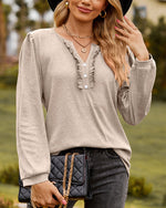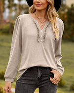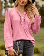 SPECIFIKATIONER Top type: Bluser Stil: Afslappet Materiale: Bomuldsblanding Lejlighed: Daglig Halsudskæring: V-udskæring Mønstertype: Ensfarvet Ærmetype: Pjuskærmer Ærmelængde: Langærmet Pasform: Almindelig Sæson/årstid: Forår,Sommer Detaljer: Pjusket Pakken inkluderer: 1 x Bluse STØRRELSESTABEL (cm) Størrelse Buste Længde S 97 65 M...
