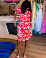 SPECIFIKATIONER Stil: Elegant Materiale: 3% Spandex, 97% Polyester Kjoletype: A-linje Kjolelængde: Midi Halsudskæring: V-udskæring Mønstertype: Tryk Ærmetype: Almindeligt ærme Ærmelængde: Kortærmet Pasform: Almindelig Sæson/årstid: Forår, Sommer, Efterår Lejlighed: Daglig Pakken inkluderer: 1 x Kjole   STØRRELSESTABEL (cm) Størrelse...