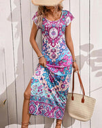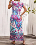 SPECIFIKATIONER Stil: Afslappet, Ferie Materiale: 100% Polyester Kjoletype: A-linje Kjolelængde: Maxi Halsudskæring: V-udskæring Mønstertype: Tryk Ærmetype: Almindeligt ærme Ærmelængde: Halve ærmer Pasform: Almindelig Sæson/årstid: Forår, Sommer Lejlighed: Daglig, Ferie Pakken inkluderer: 1 x Kjole STØRRELSESTABEL (cm) Størrelse Bu...