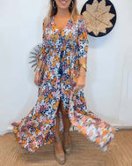 SPECIFIKATIONER Stil: Afslappet, Ferie Materiale: 5% Spandex, 95% Polyester Kjoletype: A-linje Kjolelængde: Maxi Halsudskæring: V-udskæring Mønstertype: Tryk Ærmetype: Almindeligt ærme Ærmelængde: Trekvartærmet Detaljer: Knapper, Snøre Pasform: Almindelig Sæson/årstid: Forår, Sommer Lejlighed: Daglig, Ferie Pakken inkluderer: 1 x Kjole STØ...