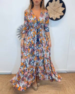 Maxikjole med blomsterprint og V-hals