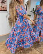 SPECIFIKATIONER Stil: Afslappet Materiale: Bomuldsblanding Kjoletype: A-linje Kjolelængde: Over knæet Halsudskæring: V-udskæring Mønstertype: Blomster-(garment type) Ærmetype: Pjuskærmer Ærmelængde: Kortærmet Detaljer: Pjusket Pasform: Almindelig Sæson/årstid: Sommer Lejlighed: Daglig, Ferie Pakken inkluderer: 1 x Kjole STØRRELSESTABEL (cm...