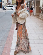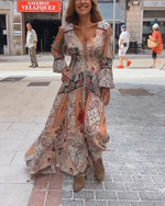SPECIFIKATIONER Stil: Afslappet, Ferie, Chic Materiale: 5% Spandex, 95% Polyester Kjoletype: A-linje Kjolelængde: Maxi Halsudskæring: V-udskæring Mønstertype: Tryk Ærmetype: Vidærmet Ærmelængde: Langærmet Pasform: Løs Sæson/årstid: Forår, Sommer, Efterår Lejlighed: Daglig, Ferie Pakken inkluderer: 1 x Kjole STØRRELSESTABEL (cm) ...