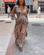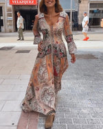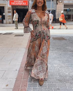 SPECIFIKATIONER Stil: Ferie Materiale: Bomuldsblanding Kjoletype: A-linje Kjolelængde: Maxi Halsudskæring: V-udskæring Mønstertype: Tryk Ærmetype: Almindeligt ærme Ærmelængde: Langærmet Detaljer: Snøre op Pasform: Løs Sæson/årstid: Forår,Sommer Lejlighed: Ferie Pakken inkluderer: 1 x Kjole STØRRELSESTABEL (cm) Størrelse Buste Længde S 97 1...