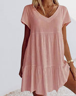 SPECIFIKATIONER Stil: Afslappet Materiale: 100% Polyester Kjoletype: Shift-kjole Kjolelængde: Over knæet Halsudskæring: V-udskæring Mønstertype: Ensfarvet Ærmetype: Almindeligt ærme Ærmelængde: Kortærmet Pasform: Løs Sæson/årstid: Forår, Sommer Lejlighed: Daglig Pakken inkluderer: 1 x Kjole STØRRELSESTABEL (cm) Størrelse Buste Længd...
