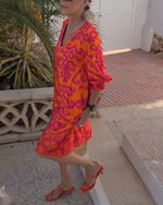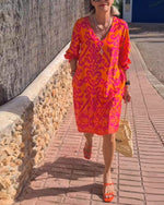 Lang mønstret feriekjole med V-hals