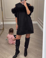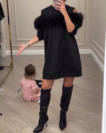 SPECIFIKATIONER Stil: Elegant, Fest Materiale: 100% Polyester Kjoletype: Shift-kjole Kjolelængde: Knælængde Halsudskæring: Rund hals Mønstertype: Ensfarvet Ærmetype: Puf-ærmer Ærmelængde: Kortærmet Detaljer: Patchwork Pasform: Almindelig Sæson/årstid: Forår, Sommer, Efterår Lejlighed: Daglig, Fest Pakken inkluderer: 1 x Kjole STØRRELSESTAB...