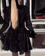 SPECIFIKATIONER Stil: Fest Materiale: Bomuldsblanding Kjoletype: A-linje Kjolelængde: Over knæet Halsudskæring: V-udskæring Mønstertype: Pailletter Ærmetype: Almindeligt ærme Ærmelængde: Langærmet Detaljer: Rygløs,Sløjfeknude Pasform: Almindelig Sæson/årstid: Efterår,Vinter Lejlighed: Daglig,Fest Pakken inkluderer: 1 x Kjole STØRRELSESTABEL (c...