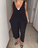 SPECIFIKATIONER Stil: Afslappet Kategori: Jumpsuits Materiale: Bomuldsblanding Mønstertype: Ensfarvet Halsudskæring: V-udskæring Ærmelængde: Uden ærmer Buksetype: Brede ben Bukselængde: Lang Pasform: Almindelig Sæson/årstid: Forår,Sommer Detaljer: Lynlås Lejlighed: Daglig Pakken inkluderer: 1 x Jumpsuits STØRRELSESTABEL (cm) Størrelse B...