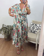 SPECIFIKATIONER Stil: Afslappet Materiale: Bomuldsblanding Kjoletype: A-linje Kjolelængde: Maxi Halsudskæring: V-udskæring Mønstertype: Tryk Ærmetype: Drop Shoulder Ærmelængde: Trekvartærmet Detaljer: Knapper Pasform: Almindelig Sæson/årstid: Forår,Sommer Lejlighed: Daglig Pakken inkluderer: 1 x Kjole STØRRELSESTABEL (cm) Størrelse Buste Læn...