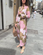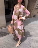 Lang blomsterkjole med slids og lange ærmer