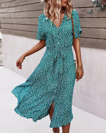 SPECIFIKATIONER Stil: Afslappet Materiale: Bomuldsblanding Kjoletype: A-linje Kjolelængde: Midi Halsudskæring: Revers Mønstertype: Tryk Ærmetype: Almindeligt ærme Ærmelængde: Ni-punkts-ærmer Pasform: Almindelig Sæson/årstid: Forår,Sommer Lejlighed: Daglig Pakken inkluderer: 1 x Kjole STØRRELSESTABEL (cm) Størrelse Buste Længde S 97 12...